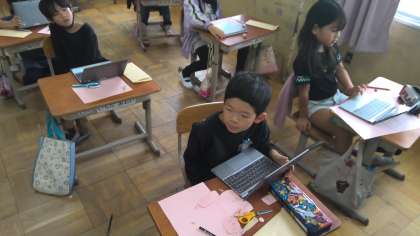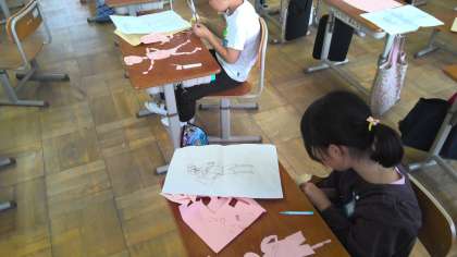 紙版画の為に版を切って張り付けてパーツごとに作っています。普段の絵を描くこととは違った体験に戸惑いながらも一生懸命に取り組んでいます。