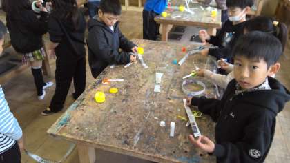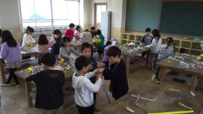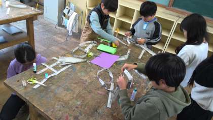 新聞紙や画用紙をのりやセロハンテープでつないで作品を作りました。つなげ方を工夫したり、わっかにしてつなげてみたりとみんなで協力しながら楽しく活動できました。