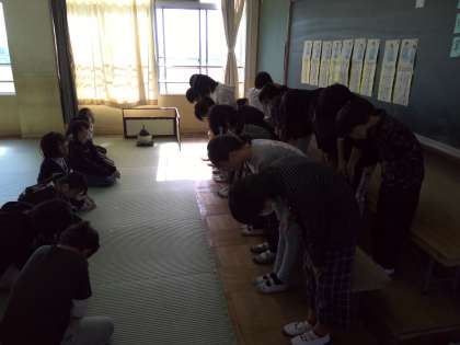 地域の方の協力のもと、茶道体験を行いました。まずは茶道の作法、礼の仕方を習いました。座って行う真・行・草と立って行う真・行・草のそれぞれを練習しました。その後、お菓子をいただきました。まずお菓子を食べて口の中を甘くするということを教えていただき、さざんかという名前の付いたお菓子を食べやすい大きさに切っていただきました。