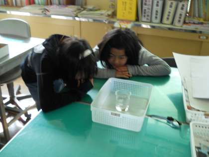 1間目は理科です。今日の実験は,氷水の入った冷たいコップをいろいろな場所に置き,空気中に水蒸気があるのかを調べました。