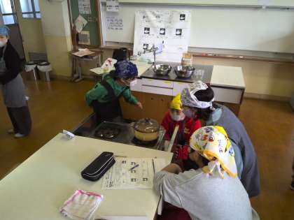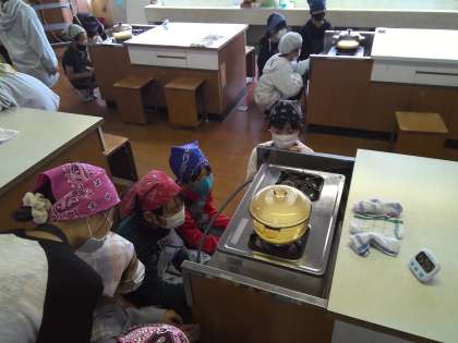 お米の吸水中に様子を観察していきます。30分ほど吸水をした後、いよいよ火にかけていきます。火加減に注意しながら様子を見ているとお鍋の中がどんどんグツグツしていき、やがて水がなくなっていく様子が観察できました。またご飯のいい香りが部屋中に広がってきて、食べるのがとても楽しみになってきました。