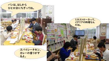 ランチルームではつばさ学級が、「へ〜、イタリア料理なんだね」「パンははしからちぎって食べるといいよ」と、上級生が下の学年の子にアドバイスしながら、和やかに食べていました。