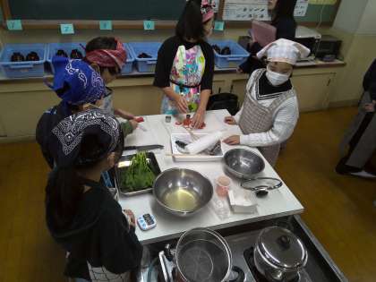 味見をした後は、お吸い物を作ります。合わせだしの味を調えたり、金時人参の型抜きをしたり、野菜の下茹でをしたりといった作業を協力しながら進めていきました。型抜きに力が必要なことや、色々な道具の準備などを経験することで、毎日家庭での食事や給食を作ってくれている人たちへの感謝の思いをもつこともできていました。