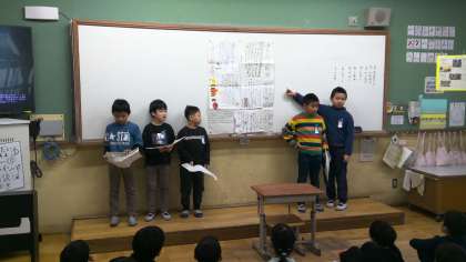地域の方にインタビューして分かったことを発表しました。新聞紙や紙芝居、パワーポイントを使って知ったことを伝えることができました。クイズを考え他グループもあり、楽しく盛り上がりながら活動できました。