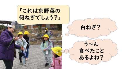 また、「地産地消:その土地で作られたものをその土地で食べること」の九条ねぎは、朝、子どもたちに「これは京野菜の何ねぎでしょう?」と問いかけると、「白ねぎ?」「ねぎ」と。「九条ねぎ」と答えられる子もいました。「五条じゃなくて?」というとたくさんの子が「九条ねぎ!」と答えていました。