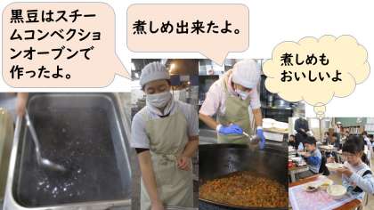 今日の献立は、ごはん・煮しめ・黒豆・九条ねぎのみそ汁。1月の和(なごみ)献立です。「煮しめ」は、家族が仲良く健康に暮らせますように。「黒豆」はまめ(真面目)に、まめ(健康)に暮らせますように。という願いが込められています。昔の人の知恵や工夫・願いが込められたおせち料理を給食でも受け継いでいこうと毎年出しています。