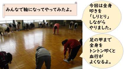 今日は、月に1度の「スマイル健やか教室」でした。いつもしている丹田(たんでん)叩きを今日はしりとりをしながら輪になってやりました。そして、最後に目をとじて、いつもいろいろなことを頑張っている自分をホメホメしました。1か月前に考えた目標(体や心が元気になる方法)をふり返り、今月の目標を考えました。スマイル健やか教室の取組を通して、より、心身の健康増進を図っています。