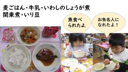 今日の献立は、麦ごはん・牛乳・いわしのしょうが煮・関東煮・いり豆です。2月3日(金)は節分。一足お先に今日は節分献立です。「いわしの頭を柊の枝にさして玄関に飾るとオニが逃げる?」「いり豆を食べて1年健康に過ごせるように願う」音声入りカレンダーを聞きながら節分についても学びました。1年生もいわしのしょうが煮を上手に食べて「おさかな名人」がたくさん!おいしく味わって食べられていましたよ。