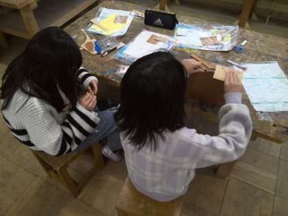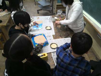 図工で取り組んでいるメッセージボード作りもいよいよ大詰めです。色を塗り、キリでひもを通す部分の穴をあけ、ニスで光沢を出しました。前の時間にニスが終わっていた人は、あけた穴にひもを通し、壁に掛けられるようにしました。あとはホワイトボードを付けて完成です。
