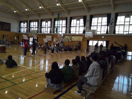 6年生を送る会で、「失敗してもええねん」、「もう一回やったらええねん」と、これまで6年生とかかわる中で声かけをしてもらってうれしかった気持ちを太鼓と歌で伝えました。力強い太鼓の演奏で、6年生の卒業を心から祝うことができました。