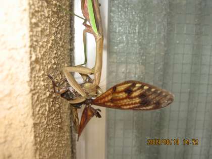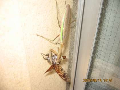 ご覧の絵は,「カマキリ」がセミを捕食しているところです。なんとも残酷なシーンですが,生きるための節理です。