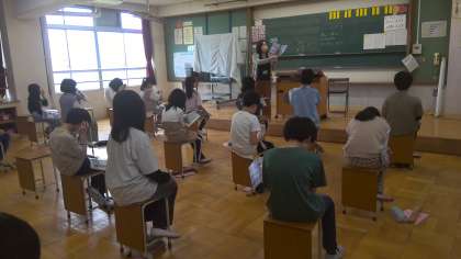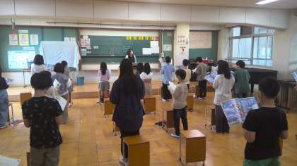 「こいのぼり」の曲を歌詞や音の高低に気を付けて歌いました。自分たちのよく知る「こいのぼり」の曲とは違いましたが、楽しんで歌うことができました。