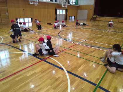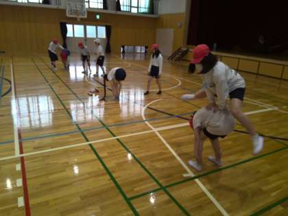 6年生の体育で体ほぐしの運動とパワーアップ体操に取り組みました。二人組でタイミングを合わせて立ち上がったり、交代で馬とびをしたり、一人で様々なストレッチをしたりしました。