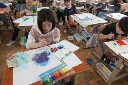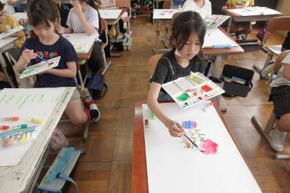 絵の具を使って、まぼろしの花を描いています。