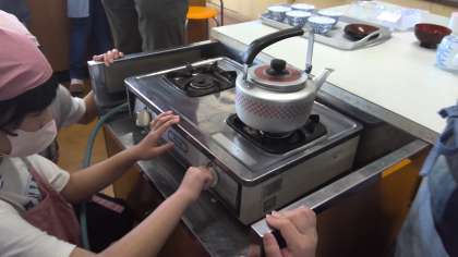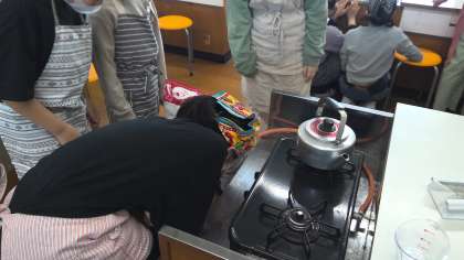 いよいよガスコンロを使ってお湯を沸かします。ガス管をつないで元栓を開けて・・・一つ一つ確認しながら安全に取り組むことができました。子どもたちの中には、IHしか使ったことがなくガスコンロは初めてという子もいて、良い経験ができました。