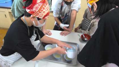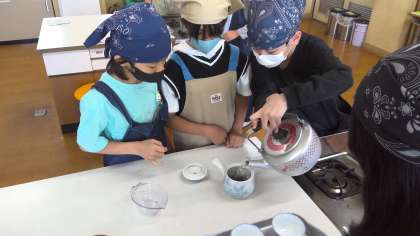 完成したお茶を注いでいきます。人数分の湯飲みに少しずつ注ぐことで味が均等になります。班のみんなで交代しながら上手に入れることができました。