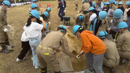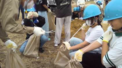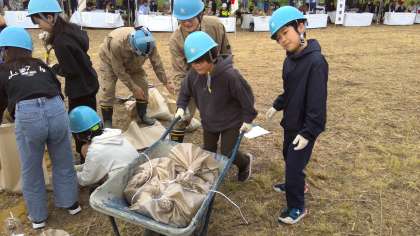 水防訓練が始まると、土のうづくりをみんなで体験しました。協力して土のう袋にシャベルを使って土を入れて、紐で縛ります。1つの重さはそれほど重くなくても、その土のうがたくさん集まることで町を守れる方法があると知ることができました。