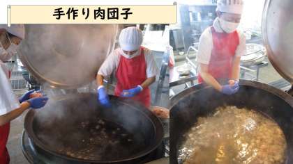 給食室で一つずつ丸めて作る肉団子は、ふんわりやわらかでおいしいです。子どもたちにも大人気。京都市の給食では、「手作り」を大切にしています。