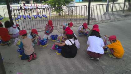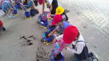 2年生はミニトマトを育てるために、植木鉢に新しい土を入れて種を植えました。これから毎日水やりをします。たくさんミニトマトができますように。