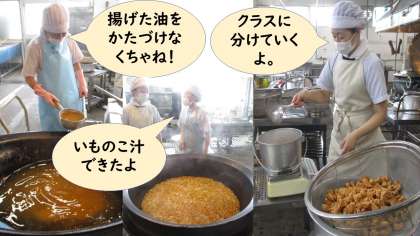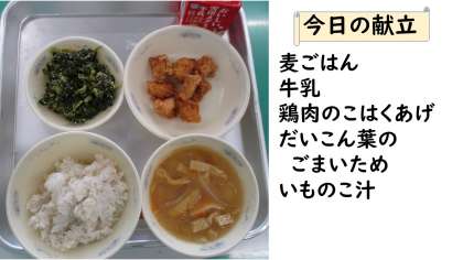 今日の献立は、麦ごはん・牛乳・鶏肉のこはくあげ・だいこん葉のごまいため・いものこ汁でした。ほんのりしょうがの味もする鶏肉のこはくあげは、外はカリっと中はふんわり、子どもたちにも大人気。だいこん葉のごまいためも、いものこ汁もだしの味や野菜の食感も楽しみながら食べられていましたよ。