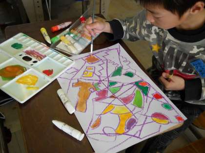 濃い色・薄い色・色合い等を考えながら,できたお部屋ひとつひとつにぬっていきます。子どもたちは色の変化を楽しんだり,はみ出さないように慎重にぬったりしていました。