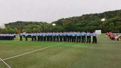凛とした空気の中、令和6年度 伏見消防団総合査閲が始まりました。淀分団は一番人数も多く動きもぴったり揃っています。この後、訓練の成果を見せていただきます。