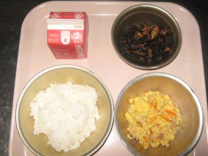 今日の給食は,『ごはん・牛乳・親子煮・ひじきの煮つけ』です。