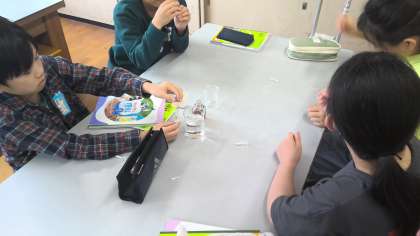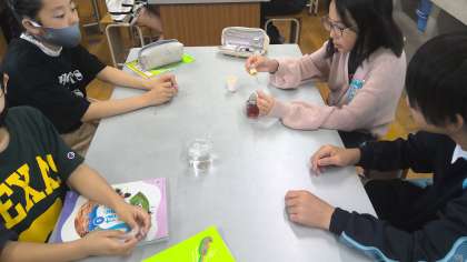 消化の働きについて調べました。デンプンを薄めた水に唾液を湿らせた綿棒と水を湿らせた綿棒を入れて、ヨウ素液を加え、色の変化を観察しました。変化は少なかったですが、動画で確認もできました。
