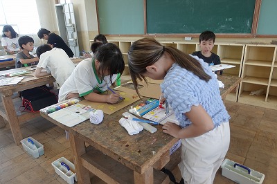 顔を出す穴をあけたので、次は楽しい感じになるように色塗りをしています。