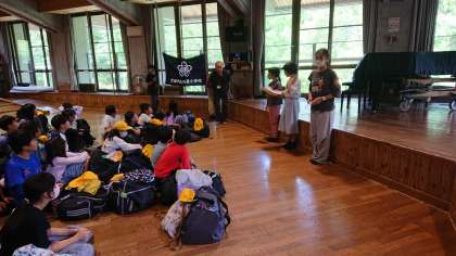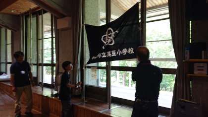 花脊山の家に着きました。館内のホールで入社式をしました。司会の人もしっかりつとめを果たしました。美豆小学校の旗も揚がりました。