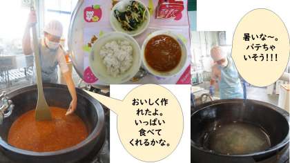 今日の献立は、麦ごはん・牛乳・ハッシュドポーク・小松菜のソテーでした。今日の給食室の気温は38度!(クーラーをつけていてもです)。給食調理員さんは、暑い中、一所懸命に作ってくださっています。 子どもたちに人気のハッシュドポークは、みんな大喜び。
