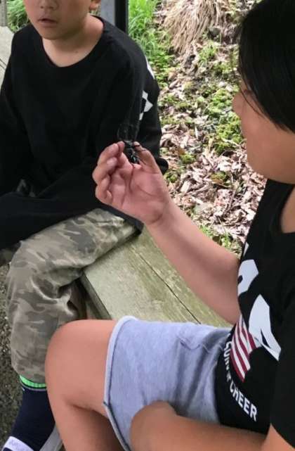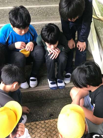 朝の集いが終わって宿舎に帰る途中、ノコギリクワガタに遭遇しました。みんな興味津々です。観察した後は、自然に返します。