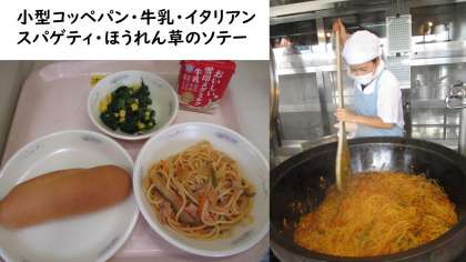 今日の献立は、小型コッペパン・牛乳・イタリアンスパゲティ・ほうれん草のソテーです。昨日から、「明日、スパゲティやんな?楽しみやわ。」と何人もの子が言っていました。そして、予定より多めに出来上がったスパゲティでしたが、みんな完食していました。