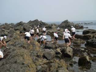 一日目,みさきの家。磯観察,スポーツ大会,きもだめしなど「進んで」「楽しく」活動していました。磯観察では足を滑らせ、肩まで海に浸かっている子もいました。