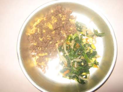 今日のビビンバも,みんなの大好きなメニューです。お皿にビビンバの具を配ってもらい,各自がごはんの上にのせて,スプーンで混ぜていただきます。韓国朝鮮料理のビビンバは,スプーンで食べます。野菜もゆでてナムルにするので,量を多く食べることができます。
