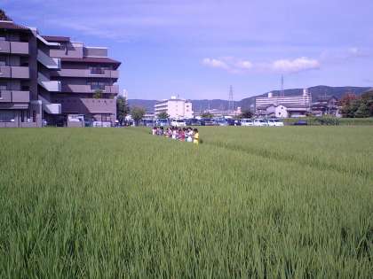 2ヶ月でここまで大きくなるとは!子どもたちの驚きも見られました。中には稲穂の中が透き通って見え,めしべらしいものが見られました。もうすぐ花が咲くのかな?冷夏の影響で生育が遅れているのかもしれません。稲刈りは10月下旬に予定しているのですが,立派な米が収穫できるように願っています。