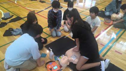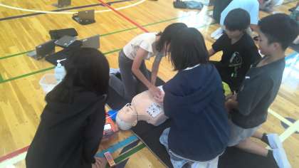 最後の講習は班全員で胸骨圧迫、AEDをリレー形式でつないで救急車が来るまでの時間対応するというものでした。みんなで声を掛け合い、学習をいかして取り組むことができました。