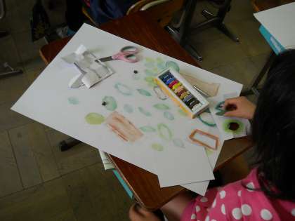 今日はコンテを使ったステンシルという技法で,背景に木や森の感じをあらわしました。