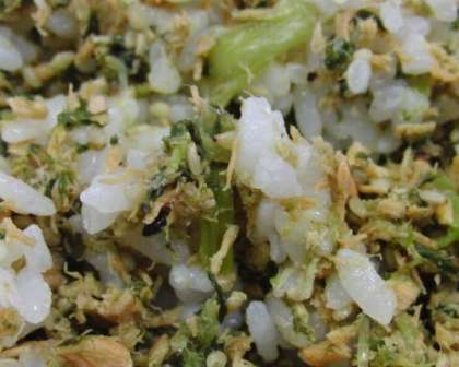 だいこん葉を油でいため、さけフレークをいれ、塩、しょうゆで味付けし、いりごまをくわえて仕上げたものです。