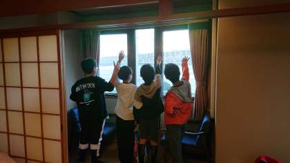 お宿に着きました。入館式をしてお部屋に入りました。子どもたちの部屋からはどの部屋も素晴らしい景色が広がっています。