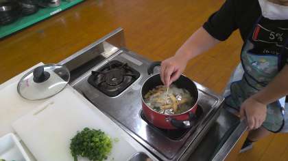 鰹節から出汁をとることにも挑戦しました、美味しそうな香りが家庭科室いっぱいに広がりました。鰹節を引き上げるときに声を掛け合いながら協力する姿も見られました。