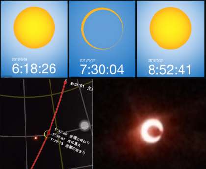スマホで撮影した画像は,露出がコントロールできなかったので,残念な画像ですが,遮光板で観測した金環は,それはそれは美しい金環でした!