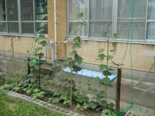 今年も「緑のカーテン」を実施しています。「緑のカーテン」とは,ツル性の植物を窓際に植え太陽光を遮断し,植物葉面からの蒸散による気化熱で教室の温度を下げようとする取り組みです。