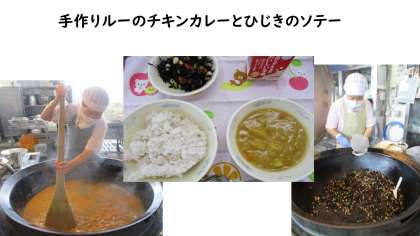 今日の献立は、麦ごはん・牛乳・チキンカレー・ひじきのソテーでした。手づくりルーのチキンカレーは、子どもたちにも大人気。ハート型のにんじんが入っていた子は「わ〜、ハート型にんじんが入ってた!」と喜んでいました。ひじきのソテーは、4種類の豆が入っていました。豆の苦手な1年生も頑張って食べていましたよ。