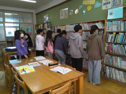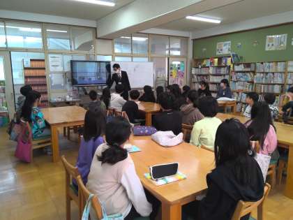 図書館の使い方を司書の先生から教えていただきました。また、グループで協力して本を探すゲームをしました。声を掛け合い、たくさんの本の中から探し出すことができました。