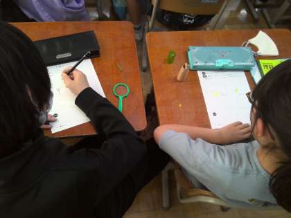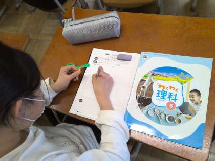 理科の学習で花のつくりの観察をしています。それぞれの部分の名前を確認したり、大きさや色、触った感じなどをじっくり観察して気付いたことを絵や文字で表しました。