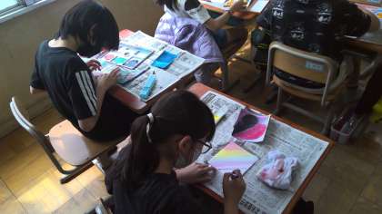 「心のもよう」の学習をしています。人の気もちについて、色合いを考えたり、指や様々な道具を使って表現したりして、思い思いの作品を作っています。