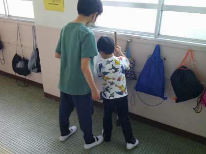 お掃除の様子です。6年生にほうきの使い方を教わったり、教わったことをもとにして自分たちでおそうじをしたりとがんばって教室やろうかをきれいにしていました。6年生ありがとうございます。