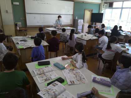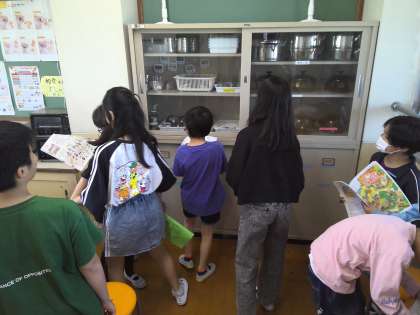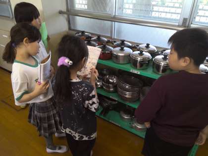 5年生になって家庭科の学習が始まりました。家庭科では、調理や掃除、裁縫や洗濯など、様々なことを学びます。この日は、これから調理実習などで使う家庭科室の見学をしました。どこにどのような道具があるのか、班ごとに確認しました。これからの学習を楽しみにしている様子の子ども達でした。