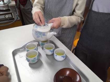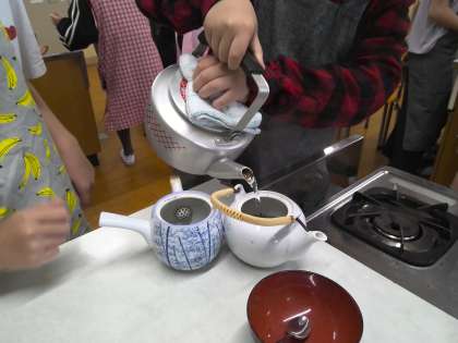 お湯をわかし、濃さが同じになるように調整して湯呑みに煎茶を注いでいました。初めて飲んだ子どもたちも多く、「おいしい!」と言っている子もいれば、「苦い!」と言っている子もいました。